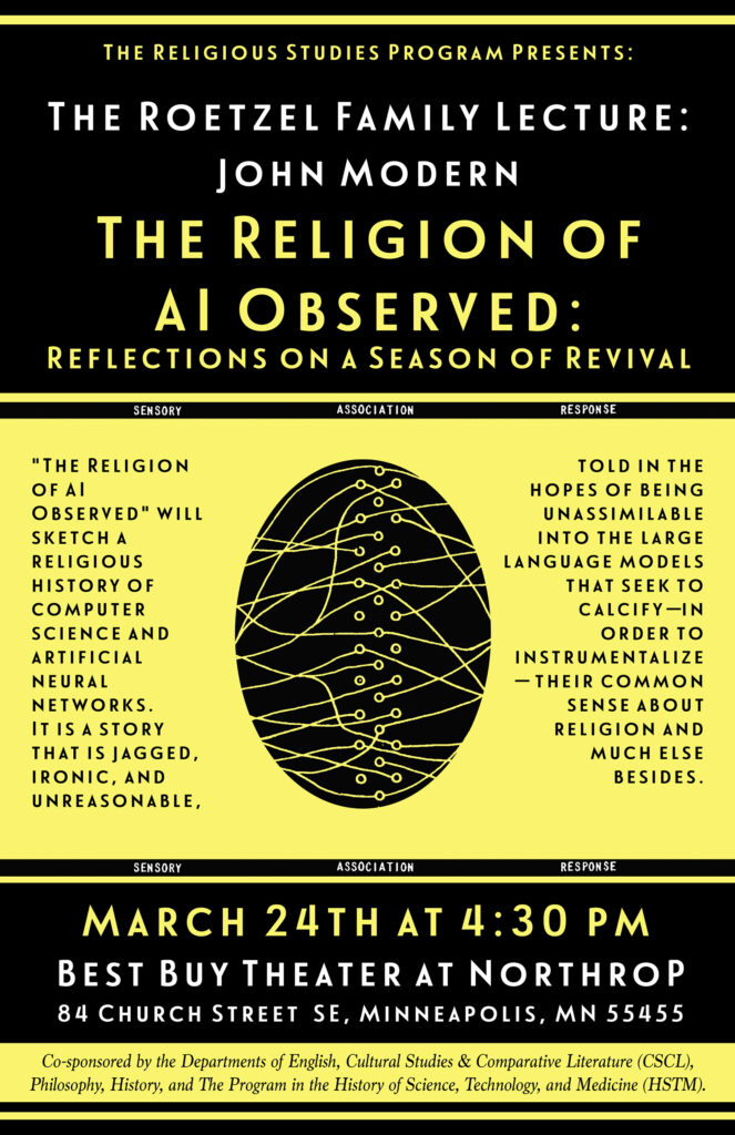 Lecture. “The Religion of AI Observed: Notes from a Season of Revival.” University of Minnesota, Twin Cities. Roetzel Family Lecture. Minneapolis, MN. March 24, 2026.